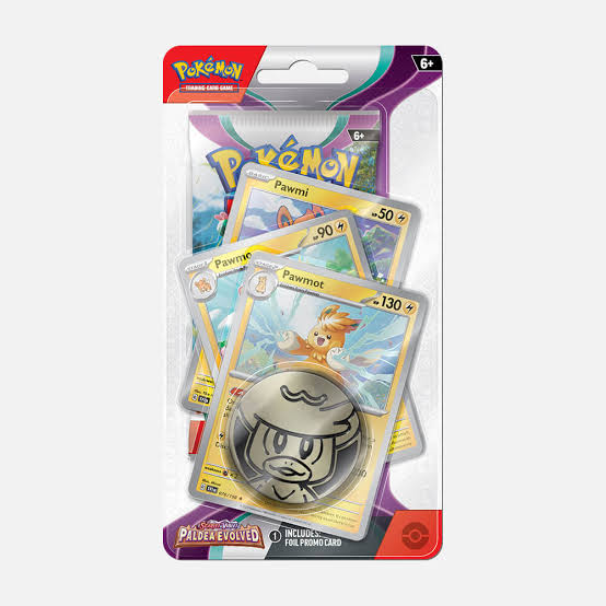 Paldea Evolved Premium Checklane Blister, comes with 1x Scarlet & Violet Paldea Evolved Booster pack, a special flip coin, and 3 promo cards.
